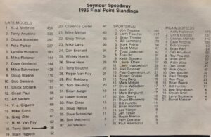 The final event of the season was a first of its kind in northeastern Wisconsin. With the ever-growing popularity of enduros, N.E.W. DIRT officials decided to schedule an event for the big ½ mile track. This would be the first time one of these events was run on such a large track. Another twist, the race would be run at night, under the lights. 108 cars signed in to race in the 100 lap or two hour event. The success of the program made the final records for the season look very well, and a decision was made to start the 1986 season off with an enduro.