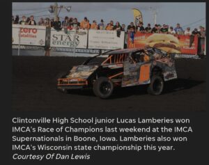 Lamberies comes from a racing family. He’s a third-generation driver. His dad, Kevin Lamberies, raced hobby stocks, sportsman and IMCA stock cars for several years at Shawano while his grandpa, Cubby Lamberies, raced at Shawano in the 1960s into the early 70s.