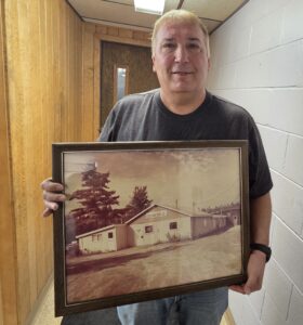 Dickie Coleman poses with a photo of the shop that currently houses Coleman Racing Products.
