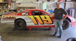 Dickie Coleman poses next to the iconic 119 super late model at their Menominee, Michigan race shop.