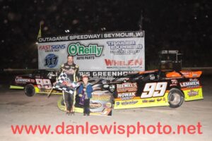 Wilinski’s IMCA modified victory was anything but a gimme. The hometown driver started fifth in the contest, and stayed in the top five, running the high side through a pair of early yellows. Beaver Dam’s Skyler Woods and Daniel Wilcox had battled up front, trading the lead while Wilinski waited patiently behind the duo, waiting for the right time to make his move.