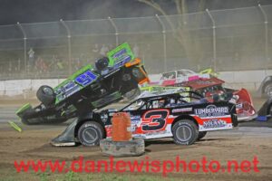 Bonduel’s Nick Anvelink went for a wild ride in the late model feature at Outagamie Speedway in Seymour June 27. He emerged unhurt. (danlewisphoto.net)