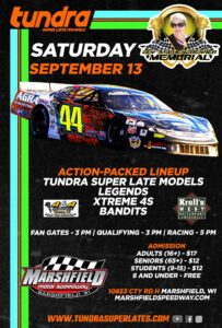 PAVEMENT PONDERINGS – The TUNDRA super late models are back in action Saturday, September 13 with the annual running of the Bev Aschenbrenner Memorial Race at Marshfield Motor Speedway. Joining the super late models will be Legends, Xtreme 4’s and Bandits. Qualifying is set for 3 p.m. with the first race getting underway at 5 p.m.